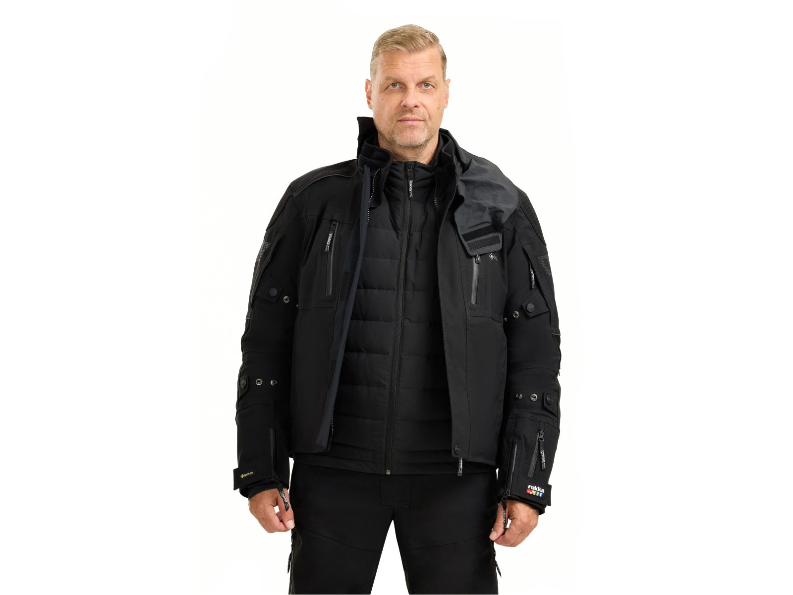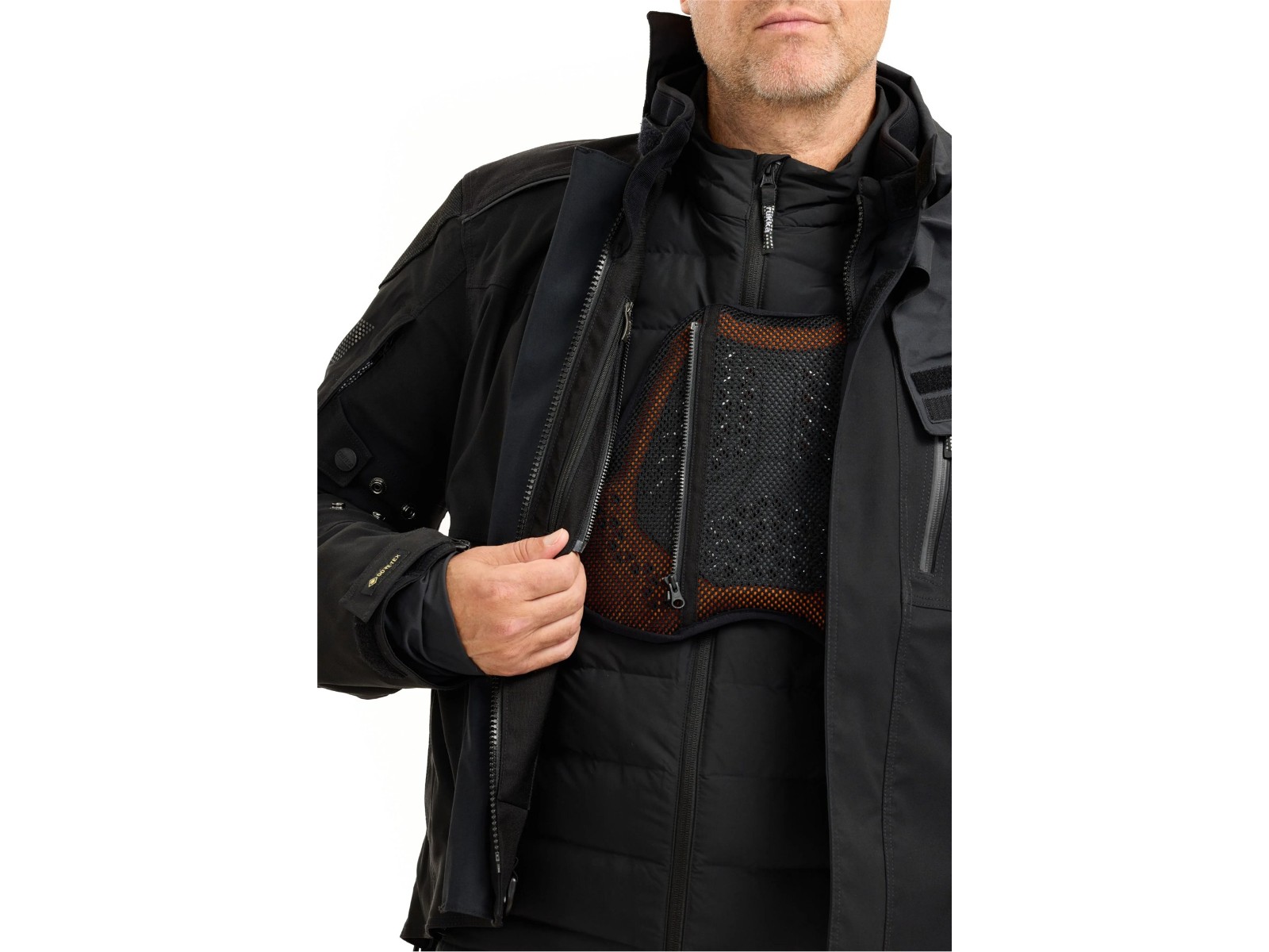 - Abnehmbarer wasserdichter Sturmkragen aus GORE-TEX Stretchmaterial