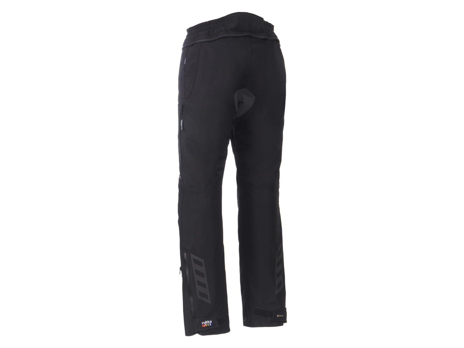 Rukka AirCushion Luftpolster und Rukka Antiglide Anti-Rutsch-System aus Schoeller Keprotec im Gesäß. Beidseitiger Bundverschluss. Rundumverbindungsreißverschluss zur Jacke. Verstellbares Hosenbeinende mit Reißverschluss und Klettverschluss. Kann mit Rukka Defence & Comfort Hosenträgern nachgerüstet werden. Abriebfeste CORDURA 1500D Verstärkungen an Hüfte und Knien. 100% atmungsaktives, wind- und wasserdichtes GORE-TEX 2-Lagen-Laminat, auf ein reiß- und abriebfestes Polyester-Shellmaterial laminiert. 1 Außentasche (mit Reißverschluss).